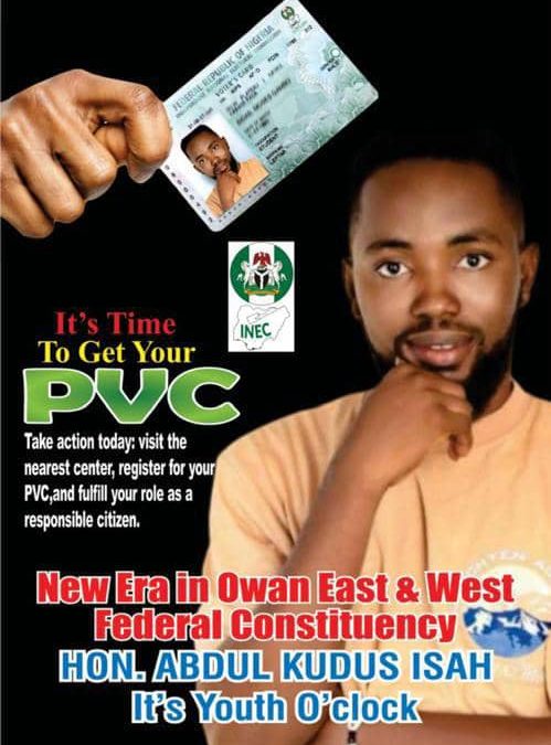 February 21, 2026The house of representative hopeful, Owan constituency 2027, Hon. Abdulkudus Isah ask all Owan people and Nigerians at large to go offer their PVC, this is the only weapon you have to make this positive change ADC are calling for comes 2027